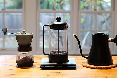 One of the best things about a French press is how easy it is to use. All you need is the coffee press, a grinder, great coffee beans, hot water, and about 4 minutes!