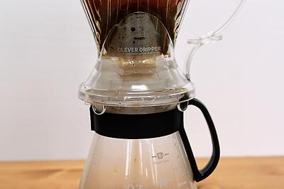 Just after two and a half minutes, it’s time to draw down your coffee. Take your Clever Dripper off the scale and place it over a carafe. The coffee will “draw down” through the dripper - leaving the grounds up top in the filter. This process should take 30-45 seconds. Make sure your carafe is big enough to accommodate the amount of coffee you’re brewing - you don’t want your fresh brew to overflow onto your kitchen counter!